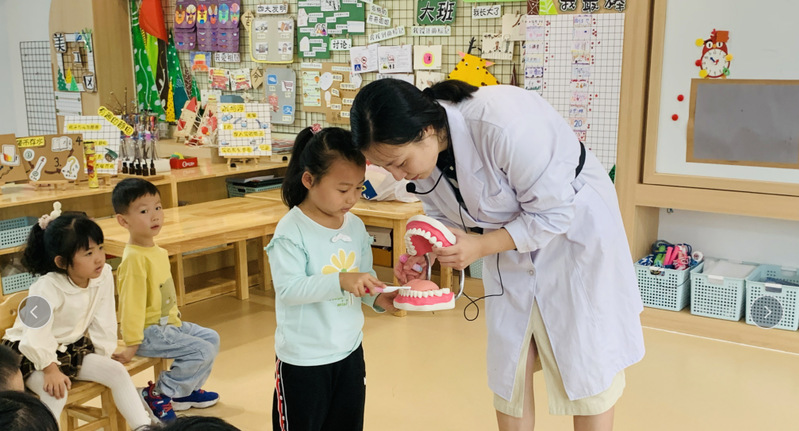 讲座会上,马娜老师用活泼欢快的语言向小朋友们介绍了牙齿的外形、特征和作用,以及乳牙与恒牙的区别等相关知识,手把手教会小朋友们如何正确的刷牙,还特别讲解了破坏牙齿和保护牙齿的行为等。