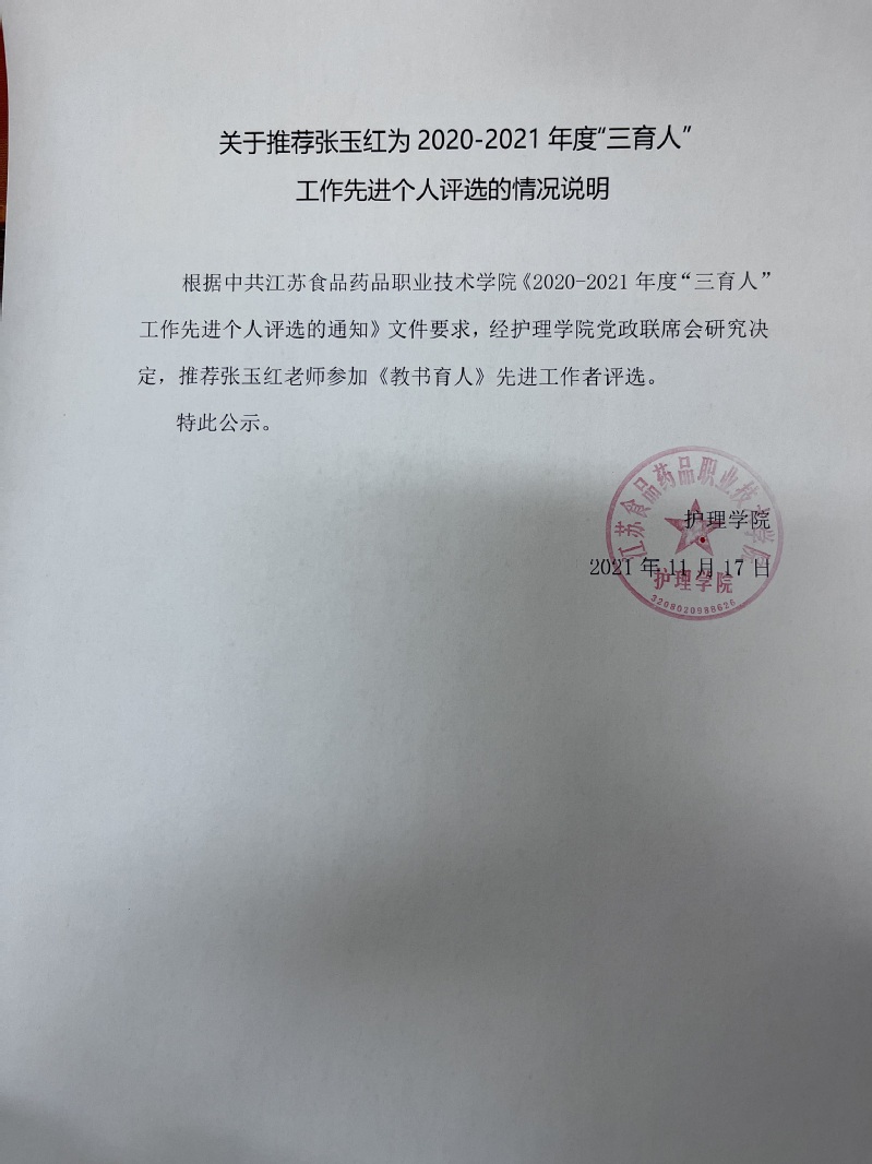 关于推荐张玉红为2020-2021年度“三育人”工作先进个人评选的情况说明