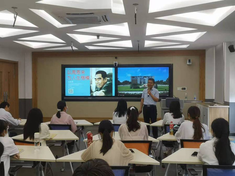 朱延华从三大方面、六个小点热情洋溢地与同学们作了分享,分别是:为什么——为什么人生需要楷模、为什么要以周恩来为人生楷模。是什么——周恩来是什么样的人、是什么让周恩来成为这样的人?怎么办——新时代对人才培养的要求?如何以周恩来为人生楷模?朱延华通过邓小平、江泽民、胡锦涛、习近平总书记等重要国家领导人对周总理的客观评价,以及基辛格、海明威等外国领导和学者对周总理的深刻映像,总结出周恩来总理的六个特质,分别是做人方面干净、干事;做党员方面忠于、善于;做革命者方面专门、专业。朱延华又通过生动有趣的故事,让同学们真切地了解到为什么周总理会成为如此优秀的人。此外,朱延华还提出需要对照新时代的要求,积极地向周恩来总理学习,不断从培养理想信念、厚植爱国主义情怀、增长知识见识等方面去努力,立志成为习近平总书记要求的德智体美劳全面发展的社会主义建设者和接班人。