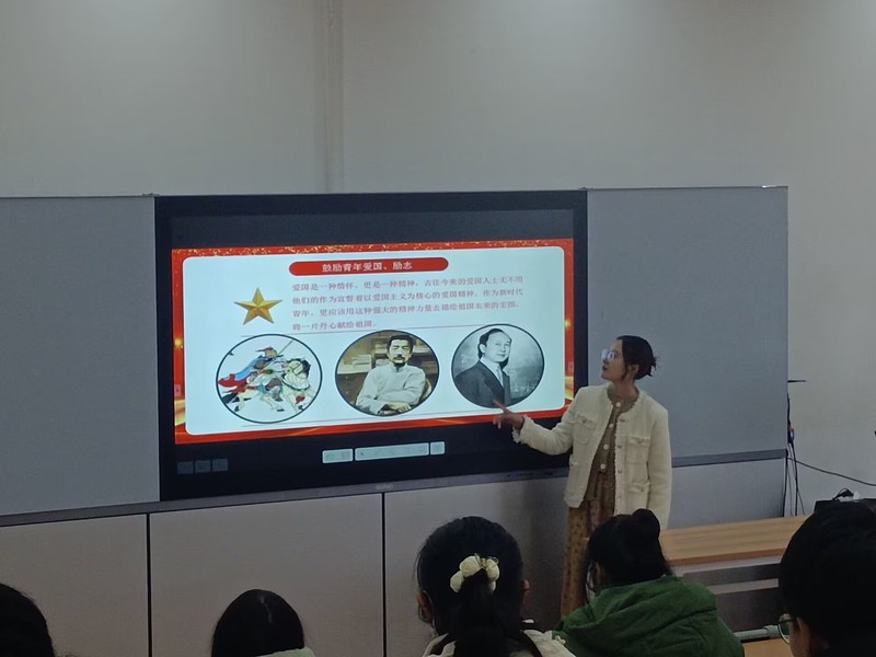 许欣娜从青年精神素养提升四部分开讲:鼓励青年爱国、励志;鼓励青年敬业、奉献;鼓励青年文明、友善;鼓励青年诚信、明礼。在第一部分列举了岳飞、鲁迅、钱学森等名人例子。爱国从不是一种潮流,它是流淌在骨子里的责任。最后,许鑫娜还带同学们诵读了PPT上的经典文章,在同学们心中激起一片涟漪,只要心中有信仰,便能在黑暗里绽放光芒。