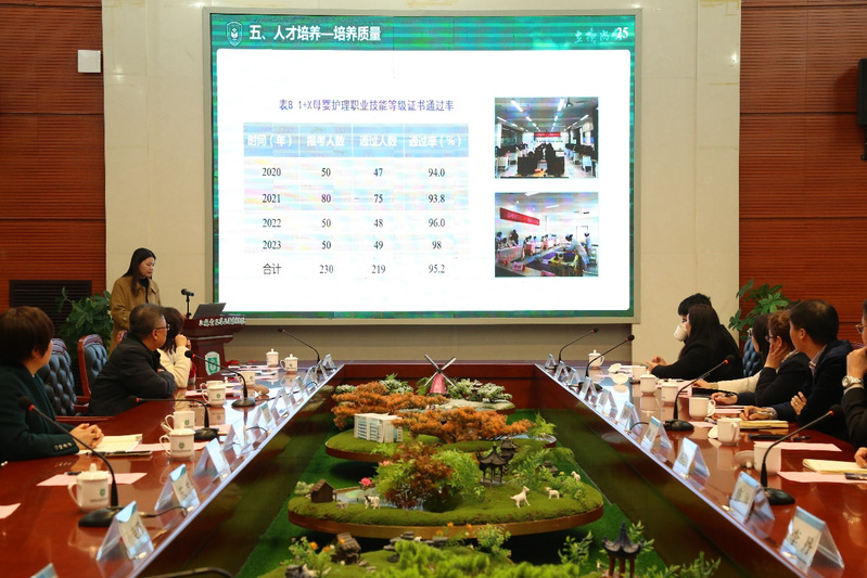 在听取护理专业“3+2”高职与本科分段培养项目情况汇报后,宋经理一行分组分组进行“3+2”员工听课、人才培养方案调研、核心课试卷及课程文档资料抽查、召开师生座谈会,会后共同参观了实训室。