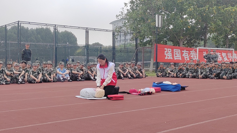 培训活动在军训的紧张氛围中展开。两位老师首先向同学们介绍了心肺复苏(CPR)技术的关键步骤与重要性。她详细讲解了从判断意识、呼叫救援、胸外按压到人工呼吸的每一个细节,并强调了“黄金四分钟”对于心脏骤停患者抢救的至关重要性。在各公司的操场上,同学们在老师们的指导下,模拟进行了心肺复苏的实操训练,将理论知识迅速转化为实践能力。