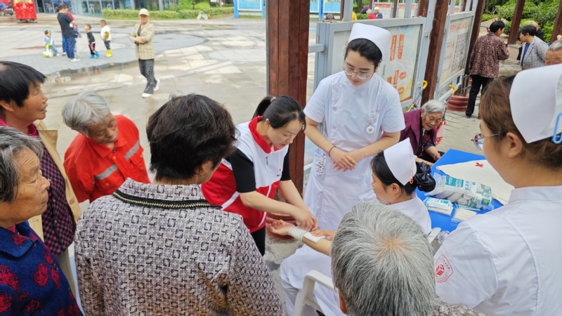 在出血包扎教学环节,对于前臂出血包扎和头部出血包扎,教师们细致地为居民讲解了不同部位出血的特点以及相应的包扎技巧。她们展示了如何正确选择包扎材料,如何运用绷带、三角巾等进行快速、牢固且科学的包扎,以达到止血和保护伤口的目的。居民们认真学习,积极动手尝试,在实践中学会了这些实用的包扎技能。