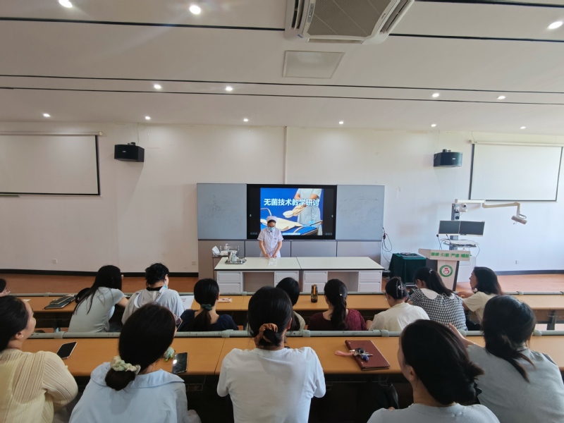 曾静老师先介绍了目的:预防交叉感染、保障患者安全、提升护理质量等,接着对无菌技术操作中的各项细节进行介绍,包括:①操作前的准备:无菌包布的折叠方法、化学指示胶带的填写、物品的检查与摆放、环境准备等;②操作中的重点:无菌包打开与使用操作,包括无菌包检查、打开方法、无菌物品取用规范;无菌溶液取用操作,包括无菌溶液质量的检查、消毒顺序为:第一次消毒从瓶口中间往上消毒,第二次消毒从中间往下消毒;冲洗瓶口不可断流、不可过多等。戴无菌手套时,注意手套内外面不可相碰,双手位置不可过低,要始终保持腰部以上,肩部以下。③操作后的用物处置,将用物按照院感要求分类处置。讲解结束后在场的老师们针对相关问题进行了热烈的讨论和分享,老师们的问题探讨与经验分享,让无菌技术的教学重点更清晰、难点突破方法更具体,为后续在实训课中指导员工掌握操作规范、强化无菌观念提供了宝贵的教学参考,进一步保障护理专业教学质量。